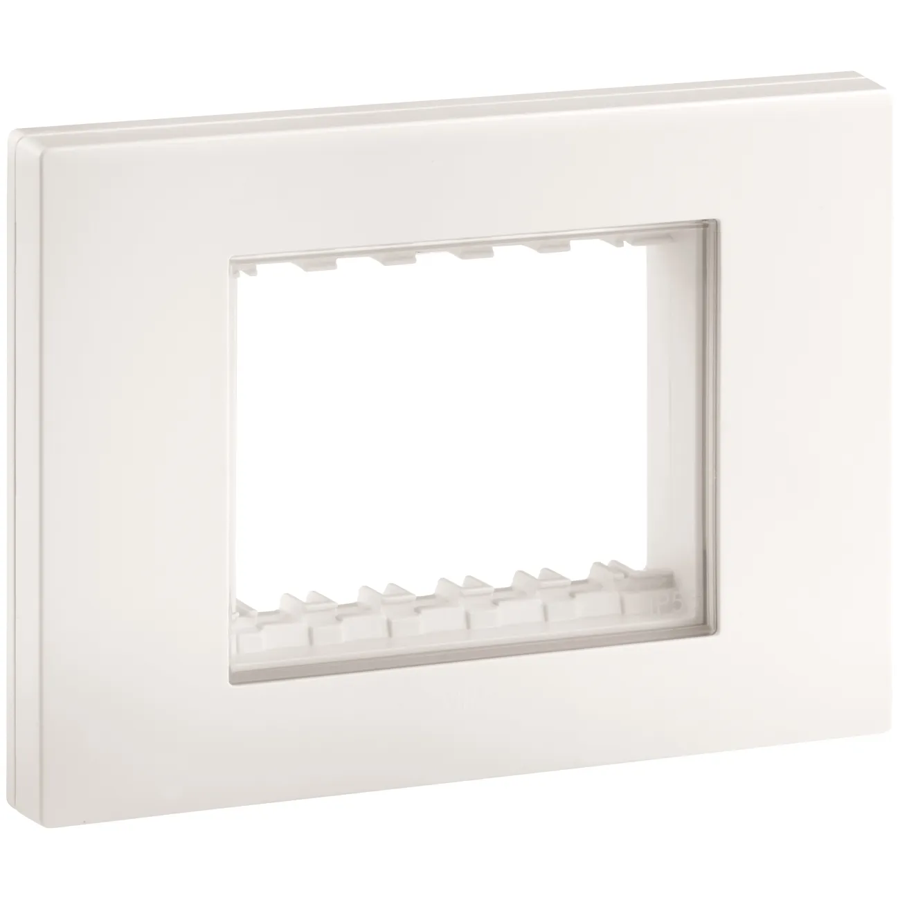 Calotta IP55 3 moduli Linea in colore bianco, completa di viti per scatole da incasso. Ideale per proteggere dispositivi elettrici da polvere e umidità in ambienti interni ed esterni.