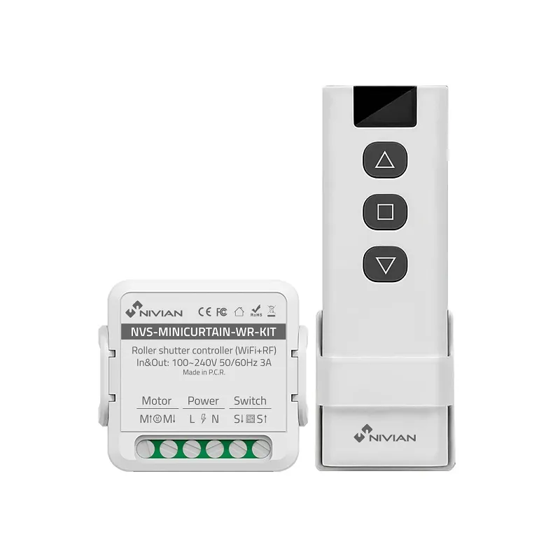 Il controller Nivian NVS-MINICURTAIN-WR-KIT consente di automatizzare e controllare le tapparelle elettriche tramite connessione Wi-Fi. Gestisci l’apertura e la chiusura direttamente dal tuo smartphone o con i comandi vocali grazie alla compatibilità con Tuya Smart, Amazon Alexa e Google Assistant.